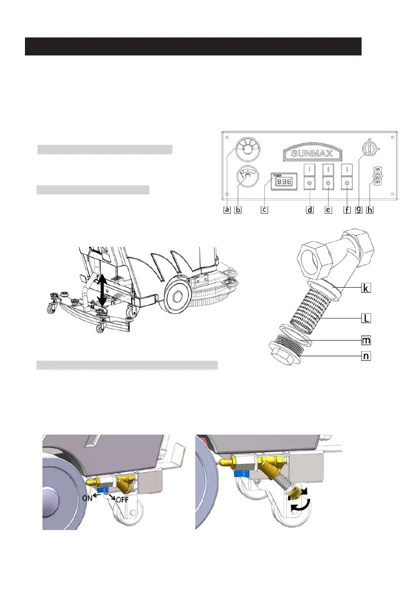 Adjust water flow rate according to floor condition. Turn regulation knob (25) to control water flow. OFF shows the closed position. ON