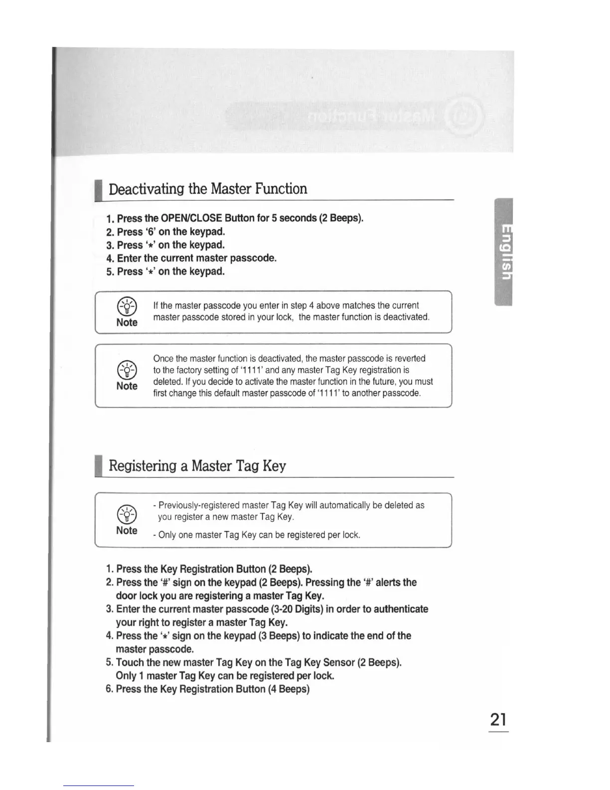 Sunnect AP501 - Deactivating the Master Function; Registering a Master Tag Key