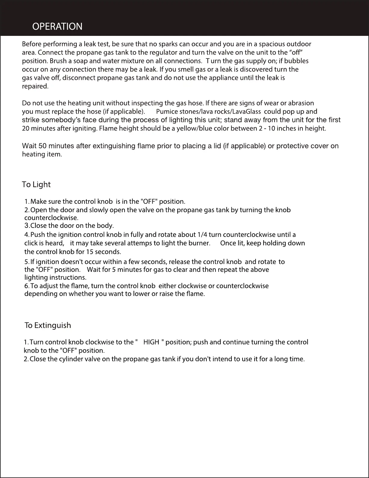 SUNNEDAY FP-001 - Operation Guide; Leak Test Procedure; Lighting the Fire; Extinguishing the Fire
