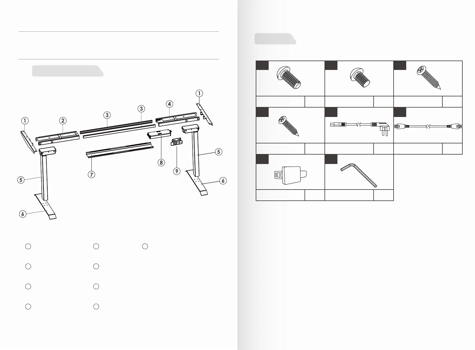 These drawings identify the parts included with your Height Adjustable Desk. Some of these parts are