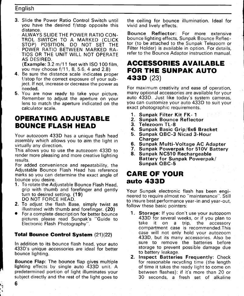 Sunpak auto 433D - Adjustable Bounce Flash Head; Total Bounce Control System; Accessories Available; Care of Your auto 433 D