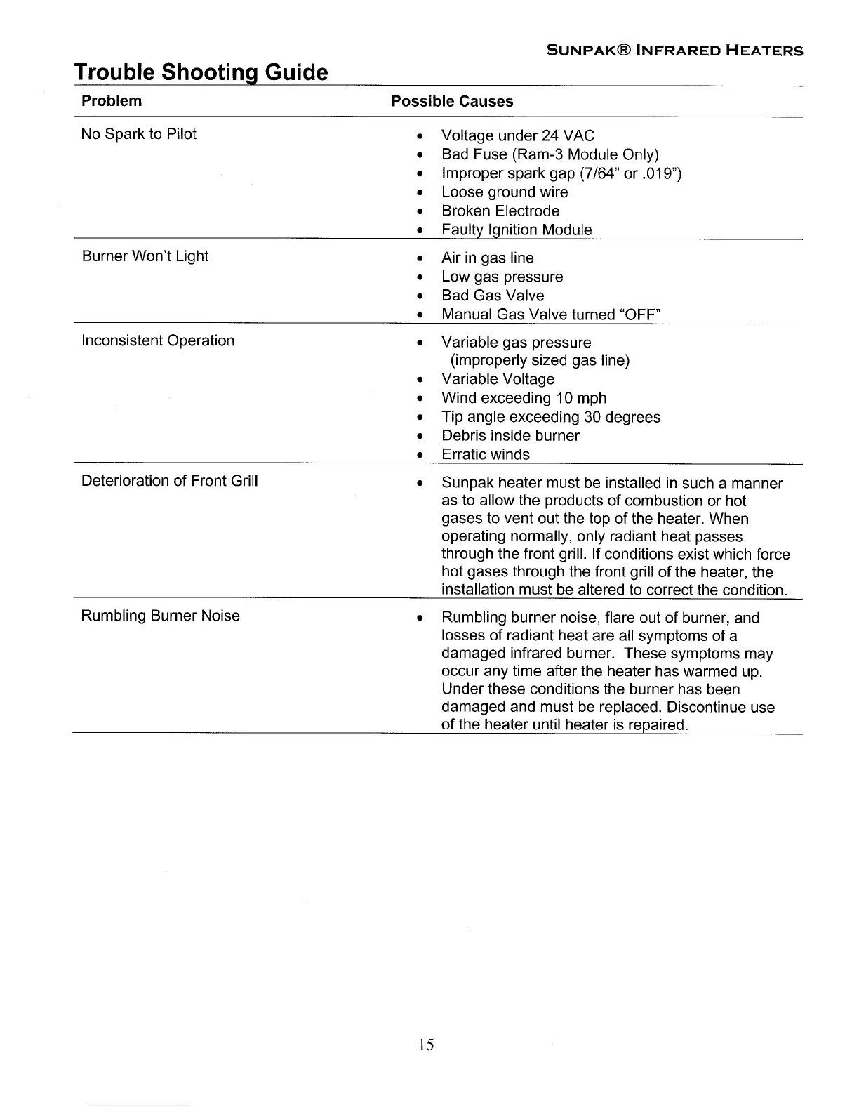 Sunpak S34 - Trouble Shooting Guide; No Spark to Pilot; Burner Wont Light; Inconsistent Operation