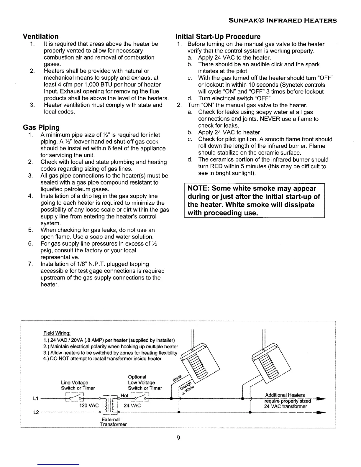 Sunpak S34 - System Setup and Start-Up; Ventilation Requirements; Gas Piping Installation; Initial Start-Up Procedure