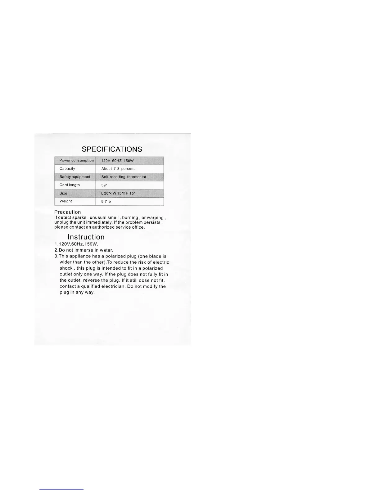 Sunpentown SD-1501 - Specifications and Instructions; Product Specifications; Electrical Safety Instructions