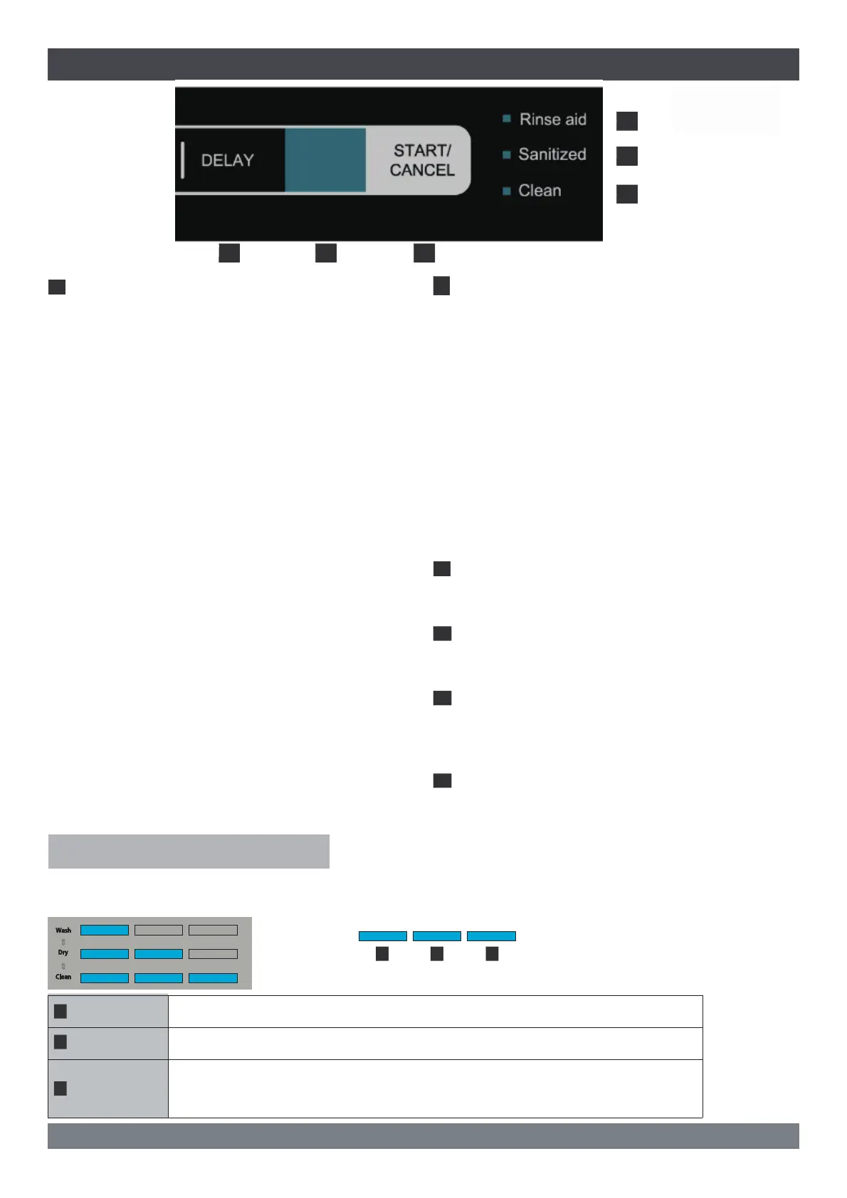 Located on ride side of the front of the dishwasher, these lights indicate how far along is the current