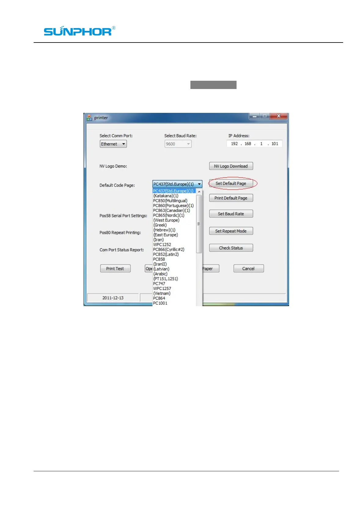 Sunphor SUP58T1 - Set or Change Language Code Page