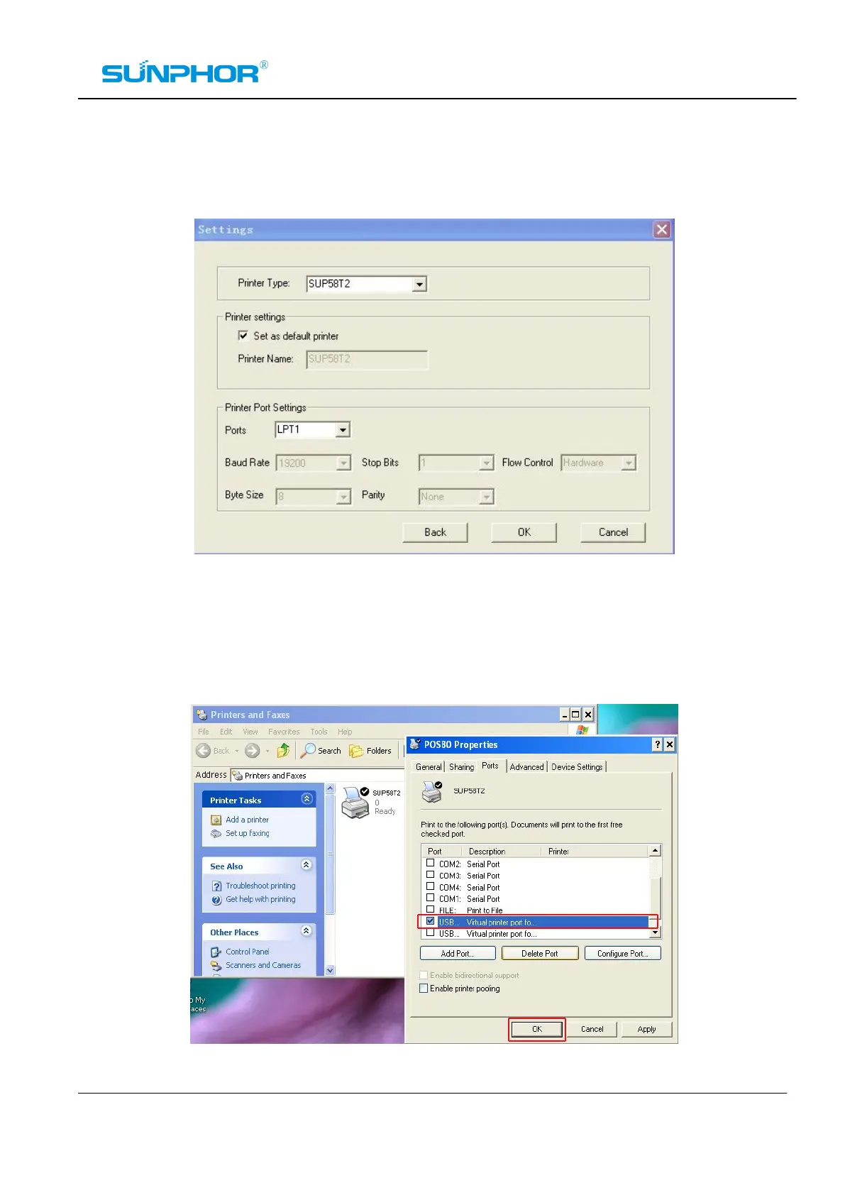 Right click the new printer SUP58T2”. Open “Propertiesto select the appropriate Port(USB, Serial or