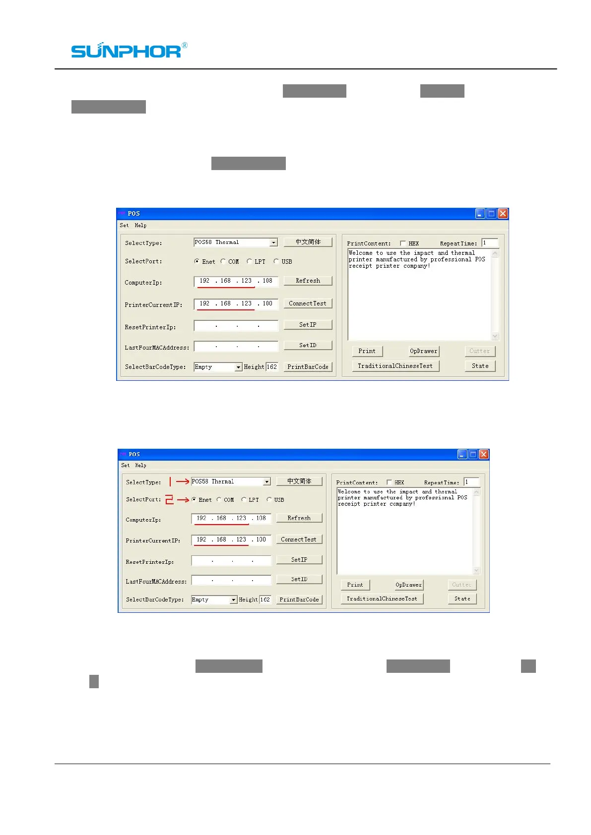 For example, the computer (or POS host) IP is 192.168.1.108, the gateway is 192.168.1 the printer IP is