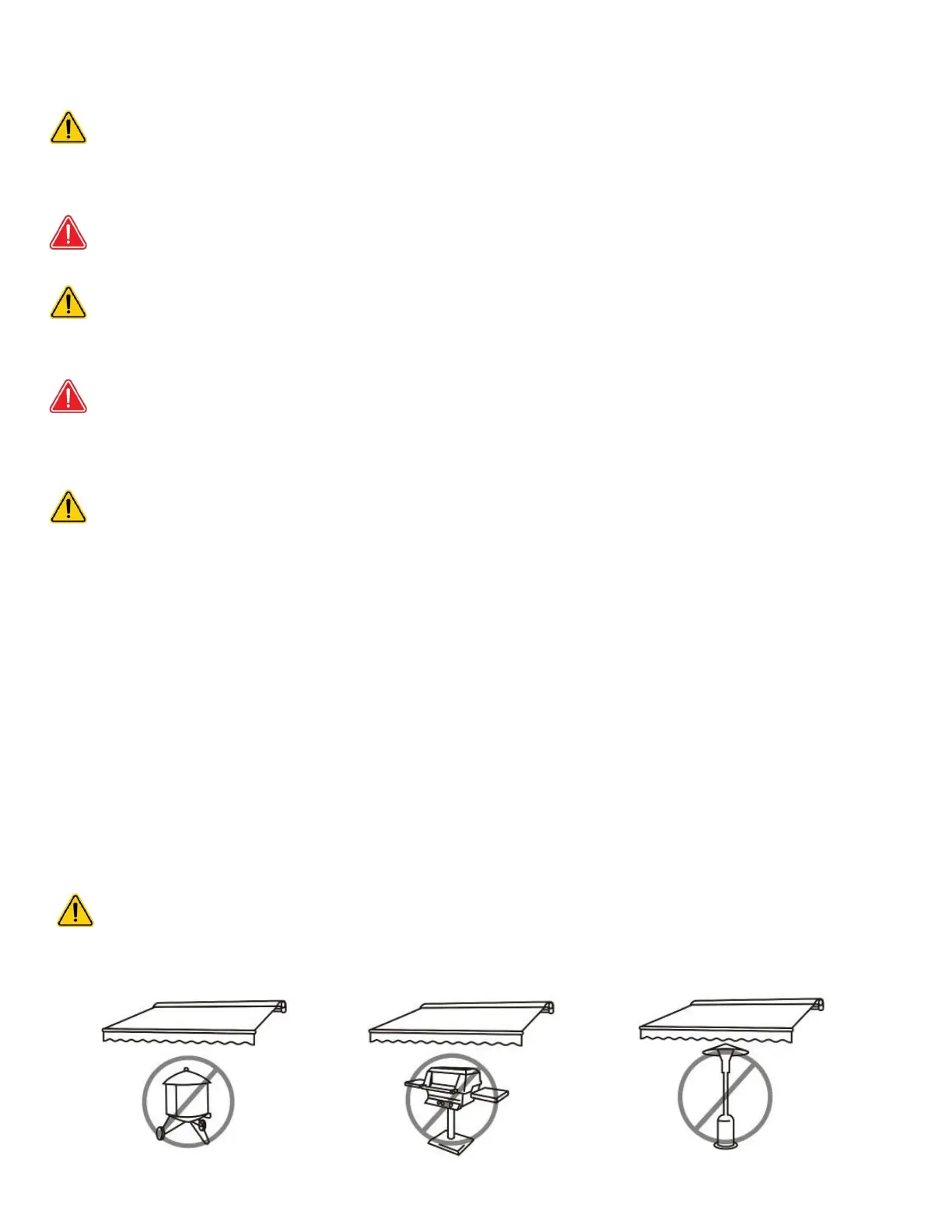 WARNING: Never use a barbeque grill, any type of patio heater or fireplace under your awning.