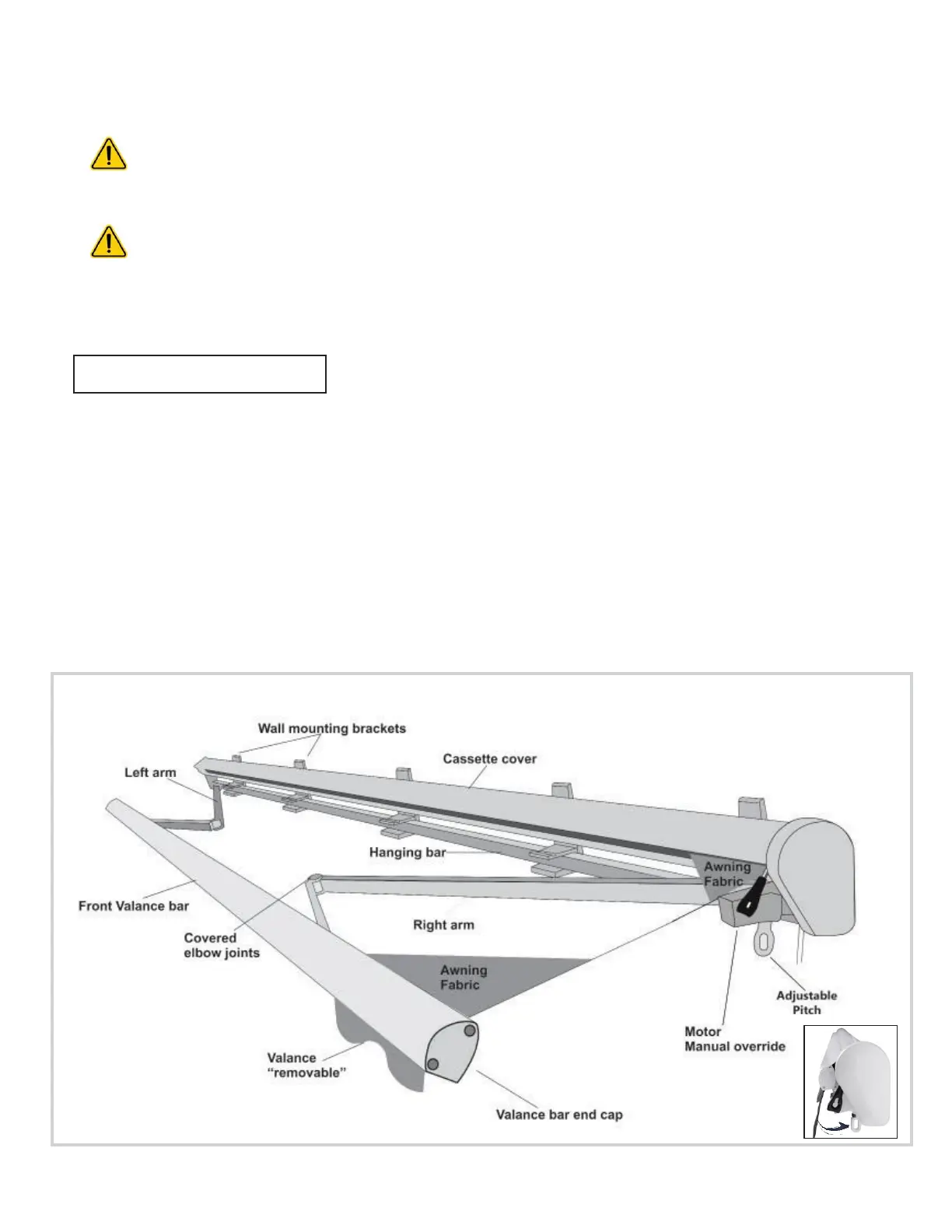 WARNING: Never attempt to repair or disassemble any part of the awning without