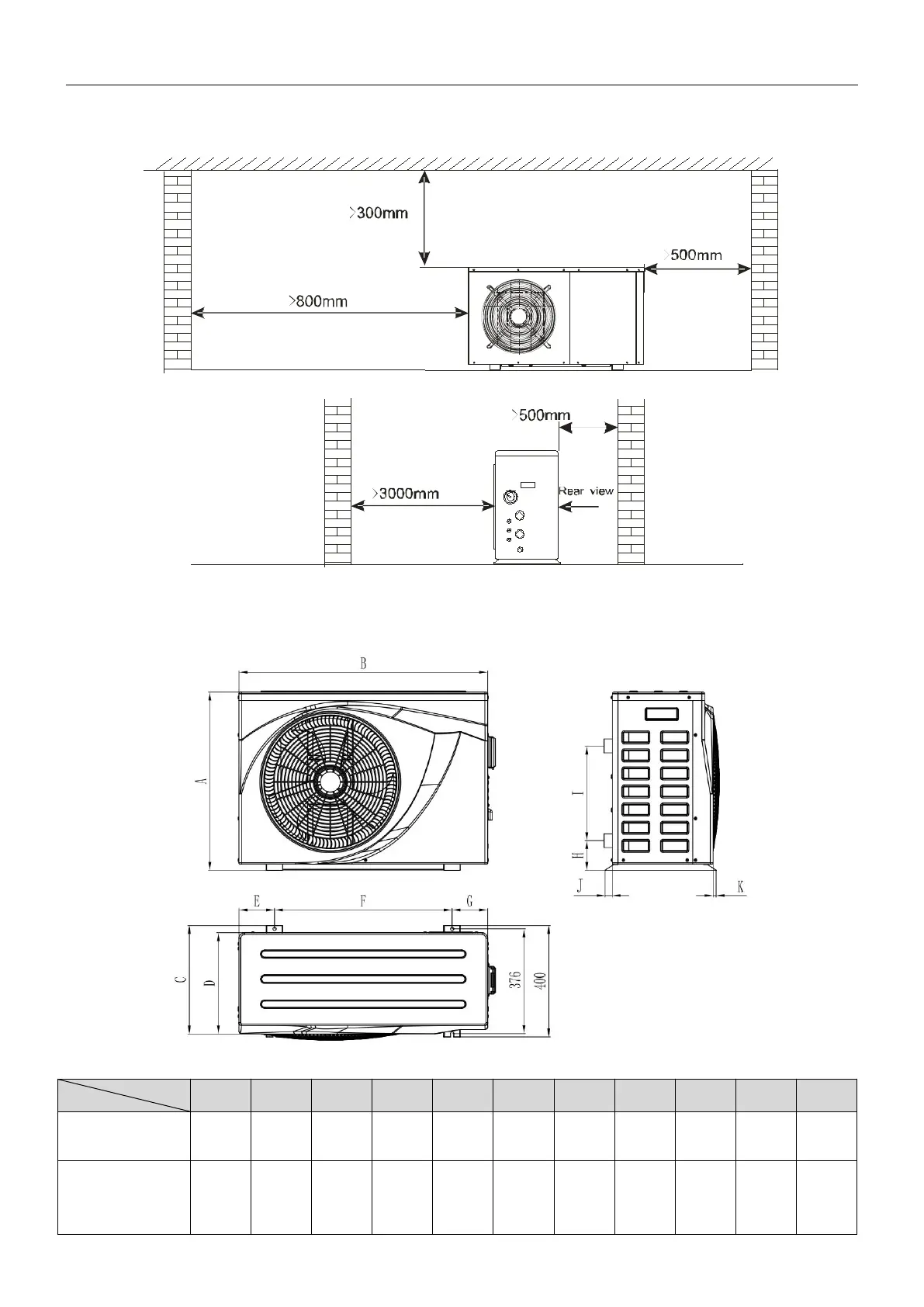 Please observe the space requirements indicated below for optimal operation and maintenance.