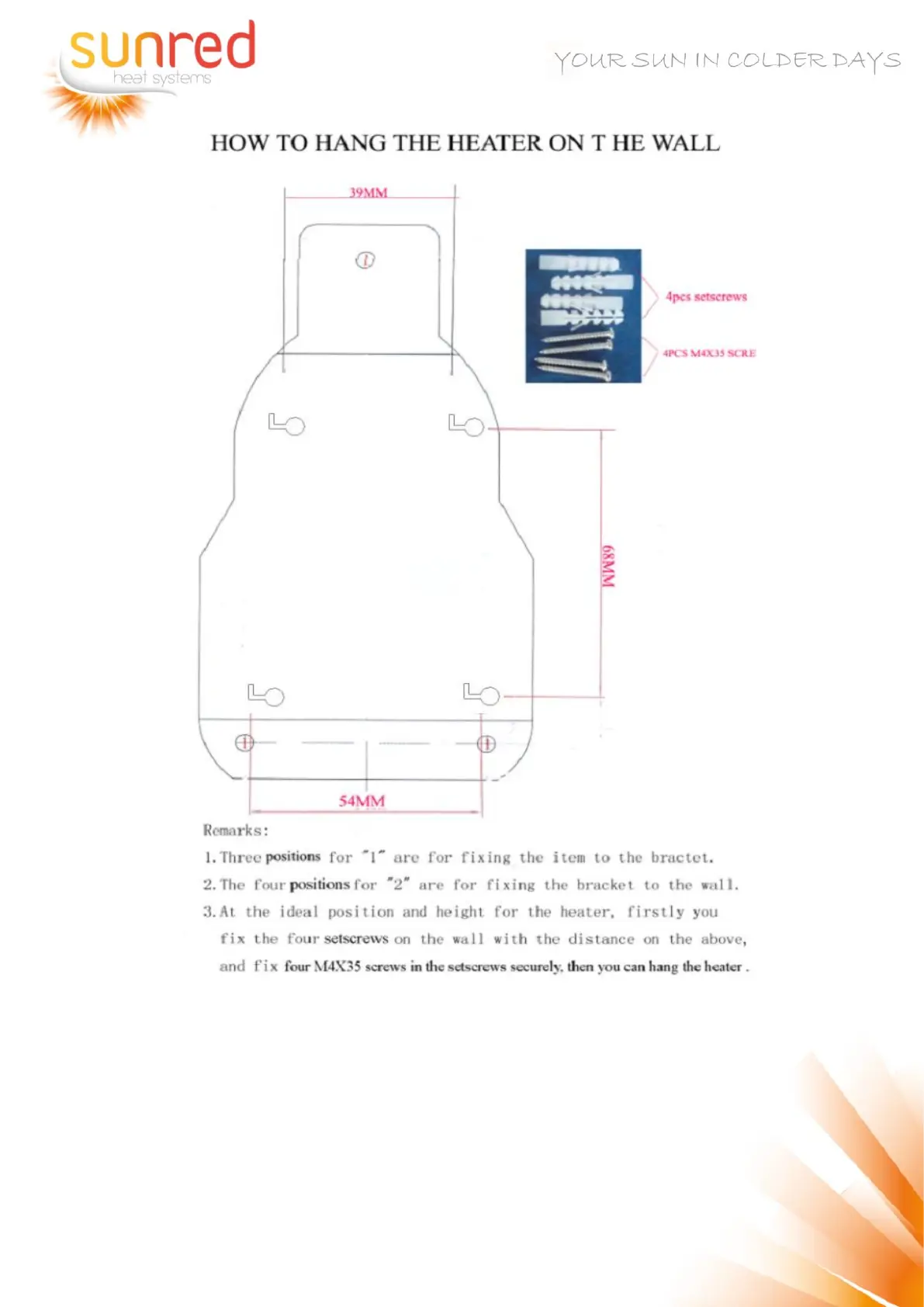 3. Après avoir déterminé l'emplacement de l'appareil de chauffage, placer les quatre bouchons dans le mur selon