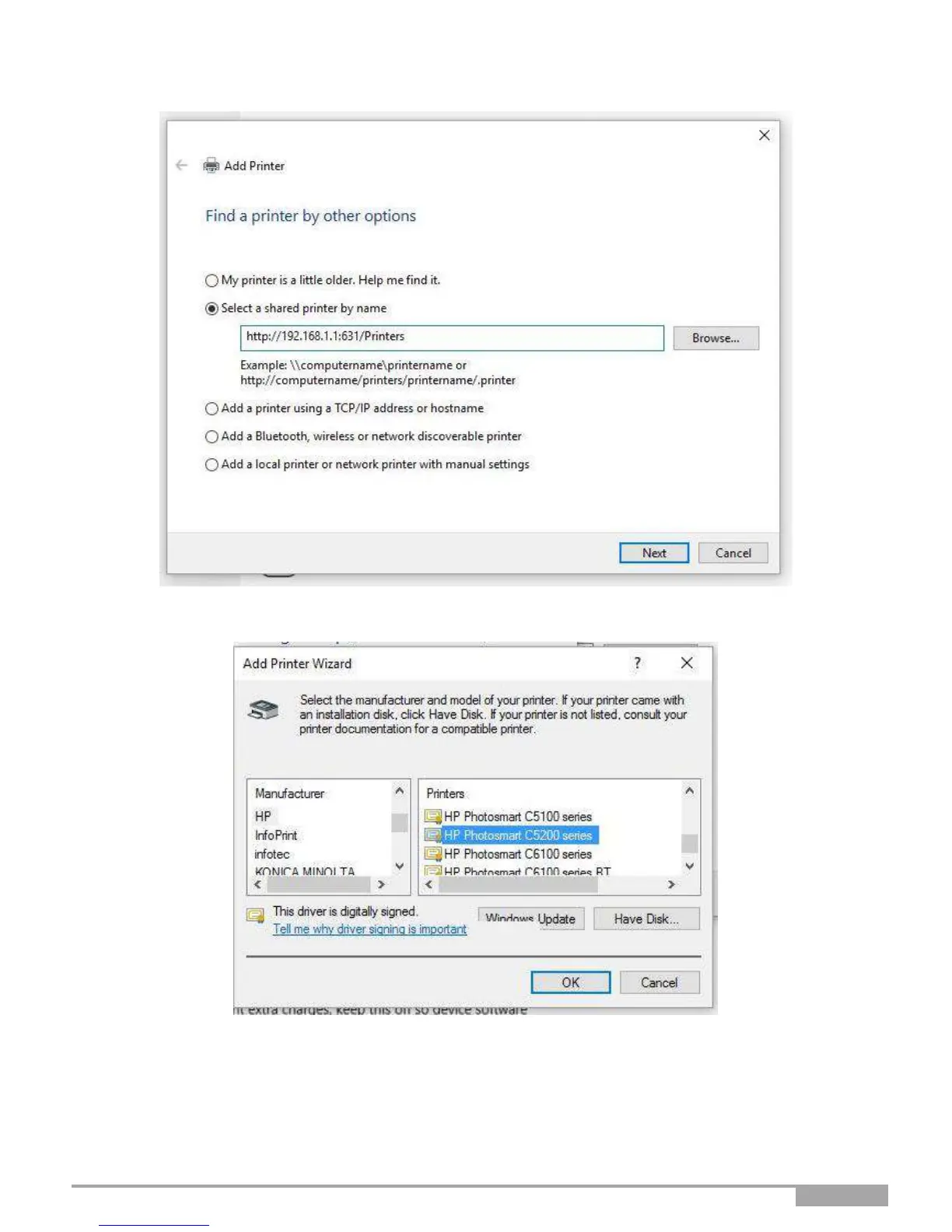 Click on “Select a shared printer by name” and enter the following value.
