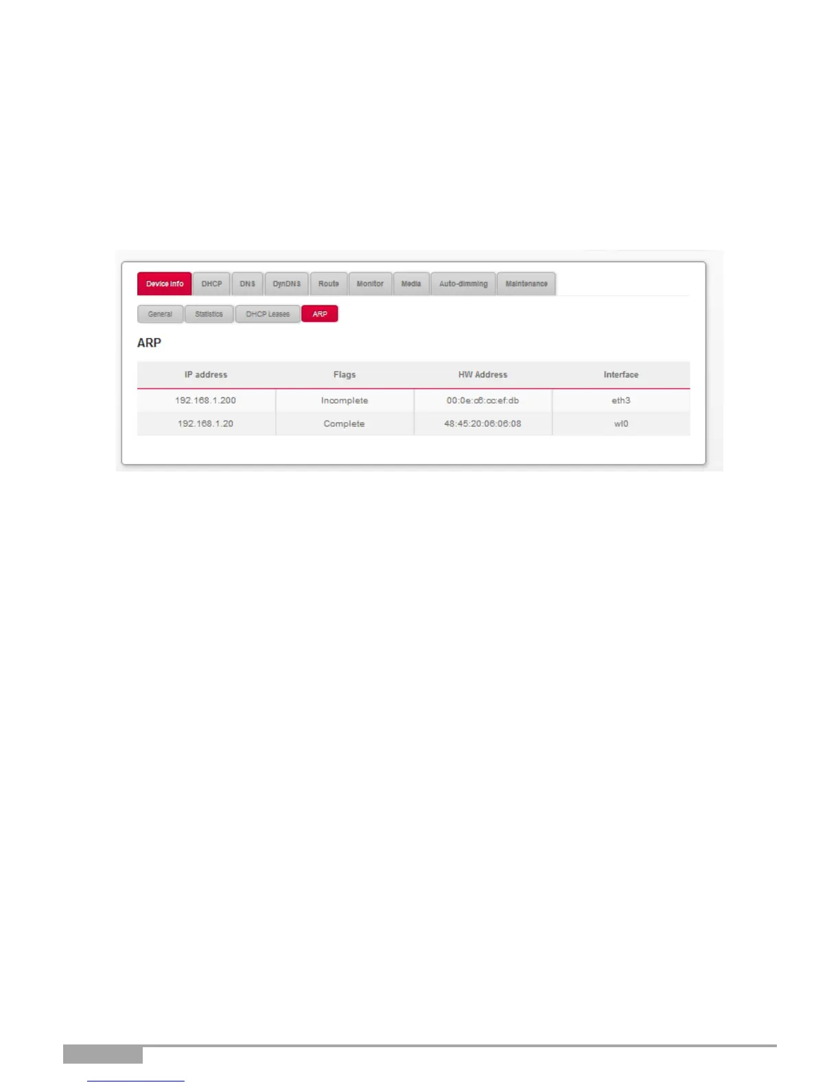In the Device Info menu, select ARP. The following screen opens: