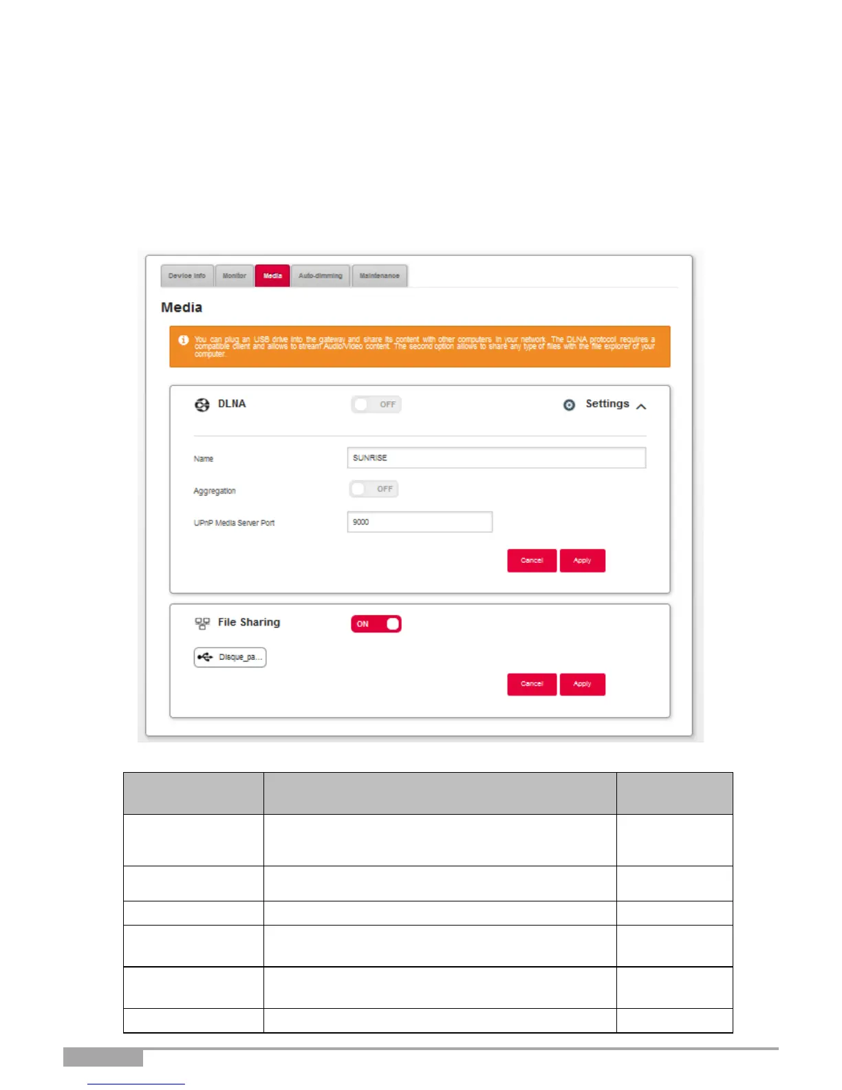 Objective: This menu lets you configure the shared services (DLNA and SAMBA) of your Sunrise