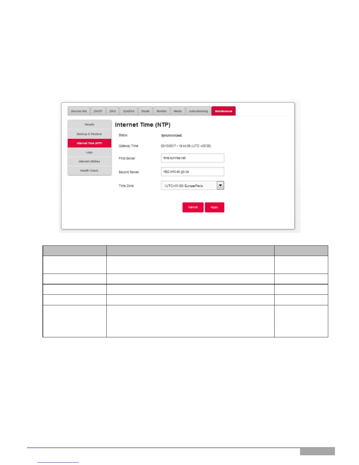 In the My Sunrise Internet Box menu, select Maintenance > Internet Time (NTP).