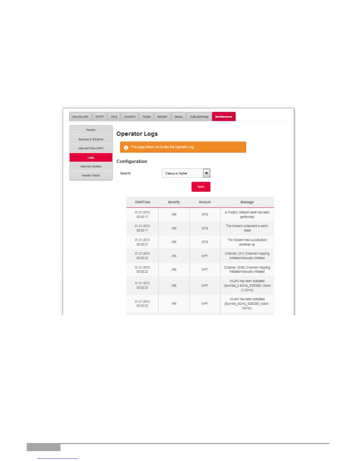In the My Sunrise Internet Box menu, select Maintenance > Logs.