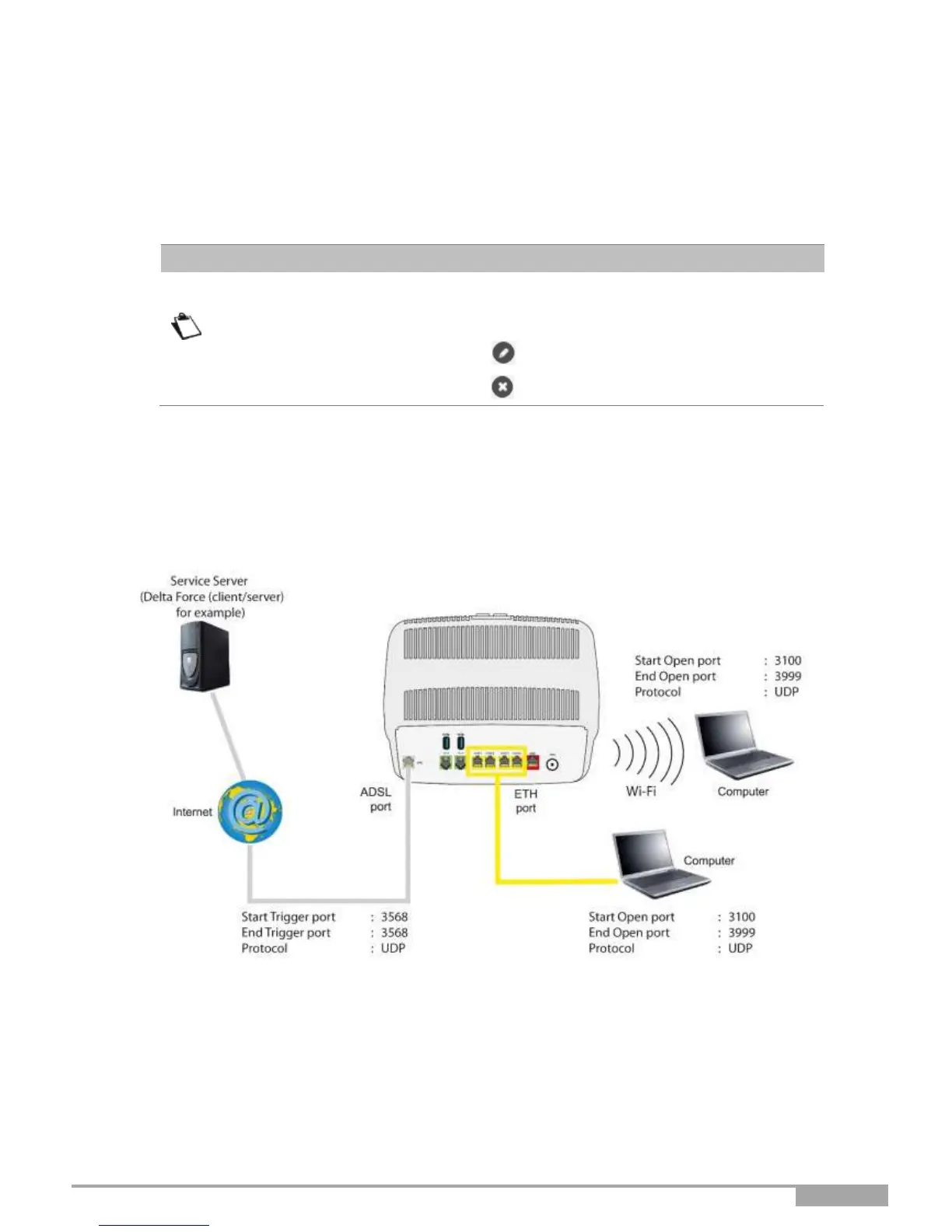 Using the "Trigger" 3568 port (WAN side), the "Delta Force" service server triggers the opening of port