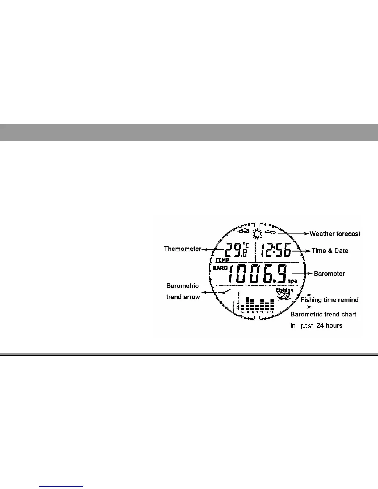 ● LCD display:weather forecast, temperature, time, date, local air pressure,
