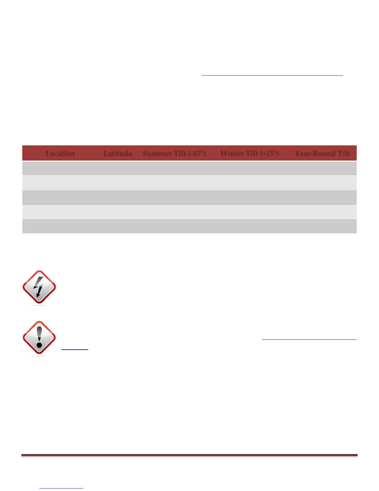 For additional tilt angles not listed, please consult the Mounting Rack Manual or Authorized SunRotor
