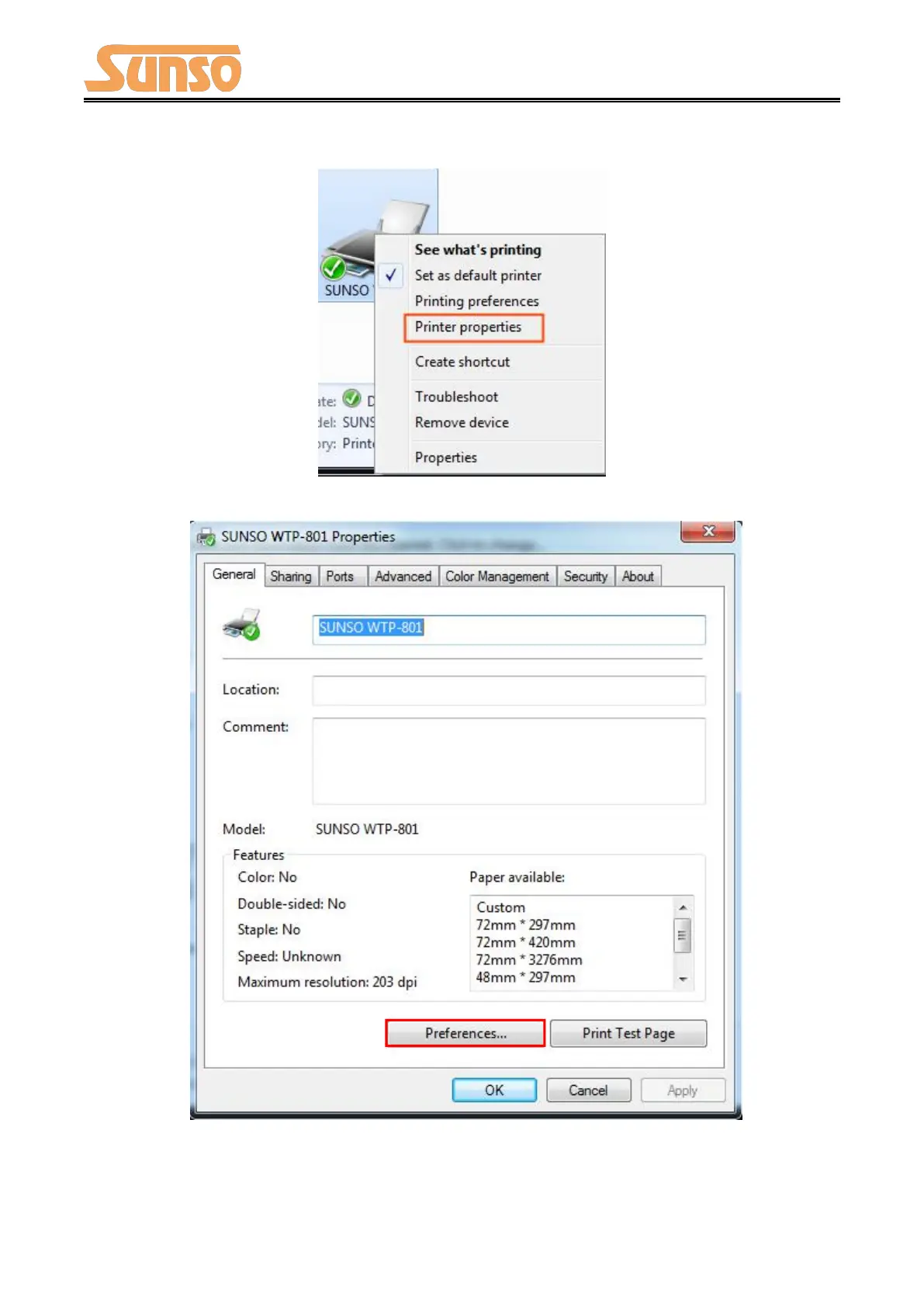 Select Printer properties in Devices and Printers, then click “Preference”.