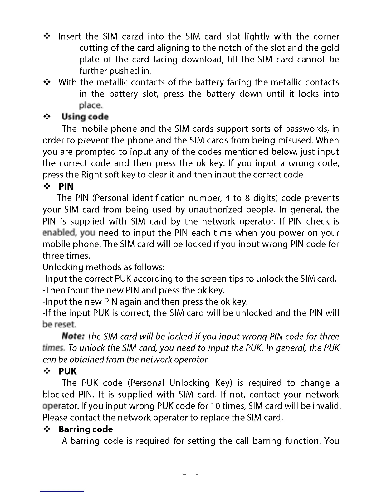 Sunstech CELT21 - SIM Card Code Management; Using PIN, PUK, and Barring Codes