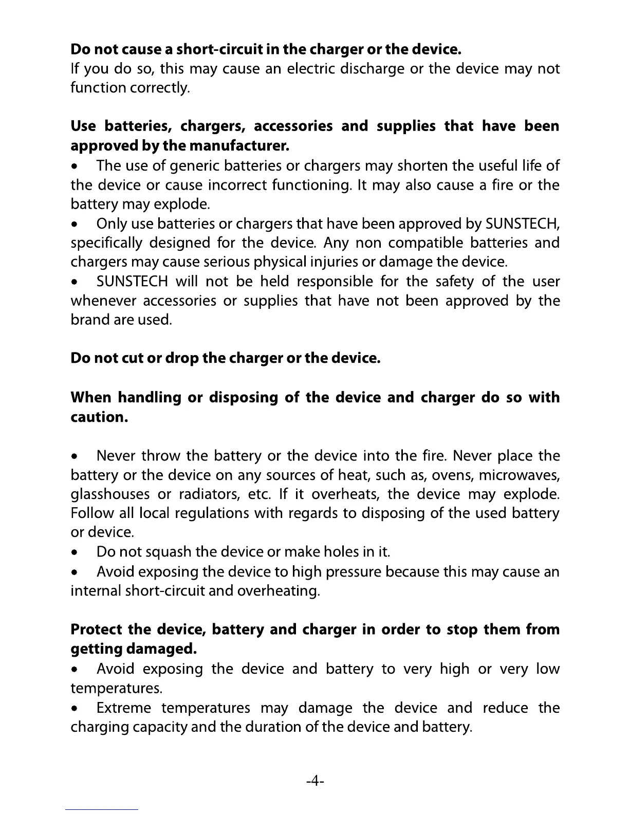 Sunstech CELT21 - Device and Charger Handling; Use of Approved Accessories and Supplies; Safe Handling and Disposal Procedures