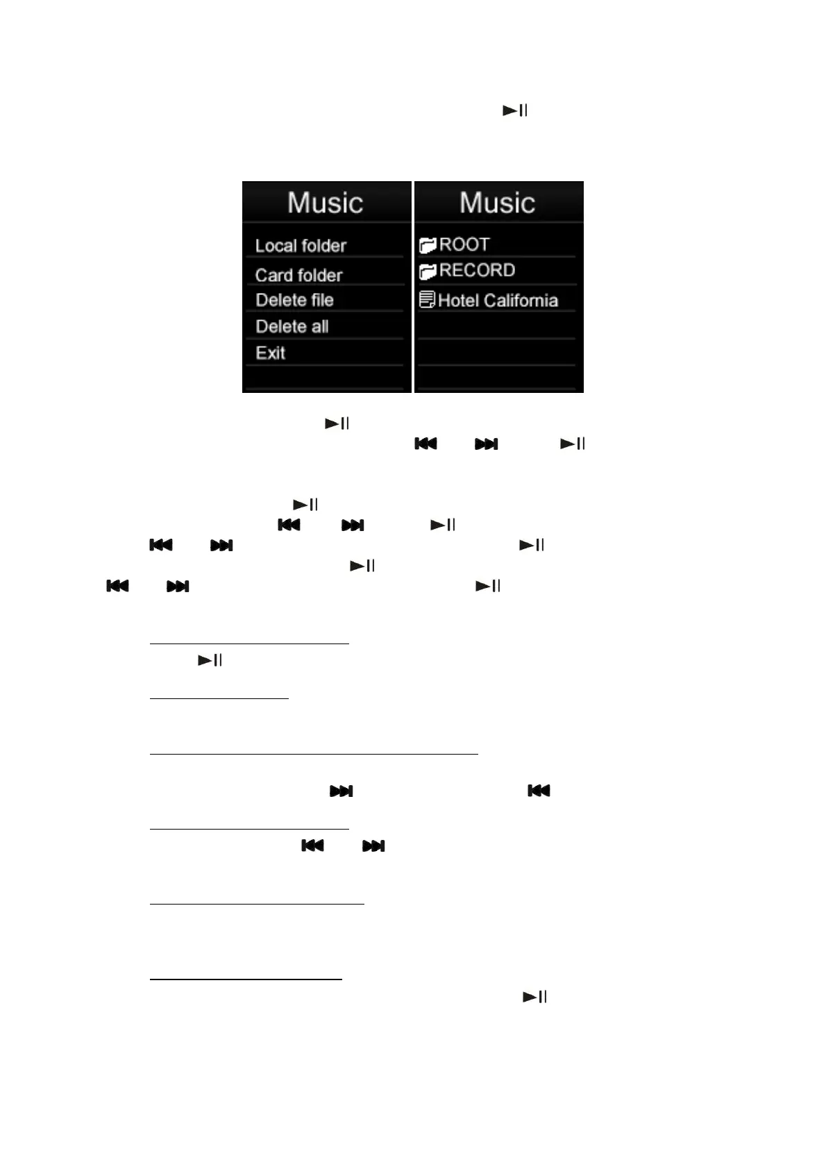 Apagar a música: Prima “ ” para entrar em “Eliminar ficheiro”. Procure ficheiros ou