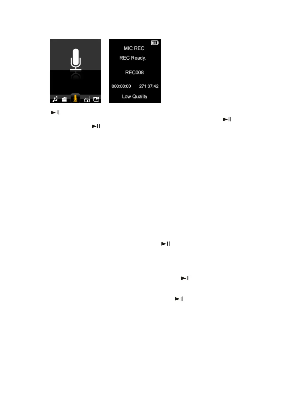 Antes de iniciar uma sessão de gravação no modo MIC REC, prima a tecla “Menu” para