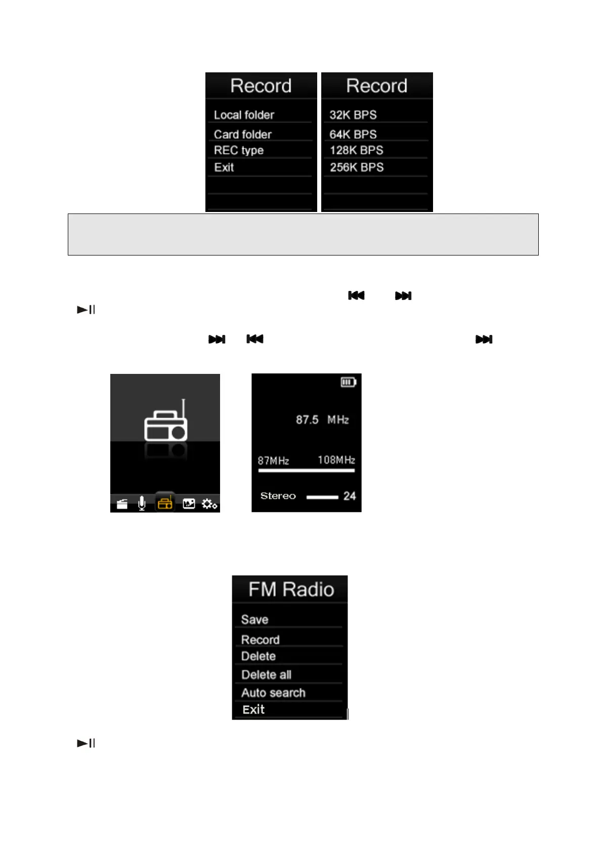 A partir do ecrã do modo FM, prima a tecla “Menu” para exibir o submenu FM. O submenu