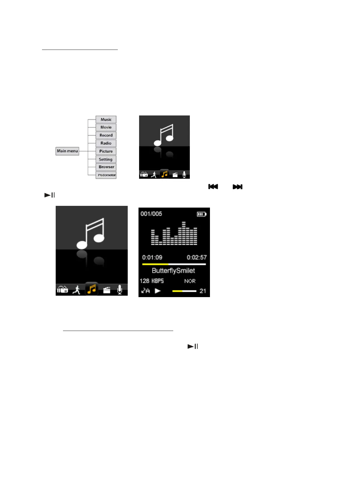 “Menu” key. Then Music files operation mode will be shown. You can select the memory