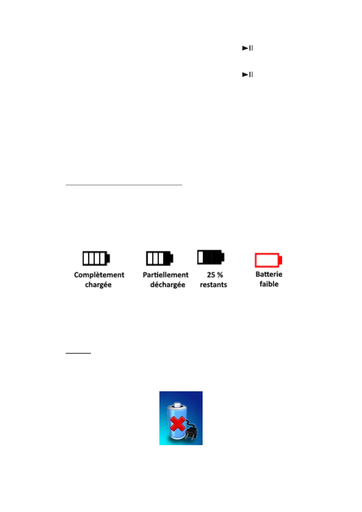 rouge vide et l’icône « Batterie faible » sera affichée. Veuillez éteindre le lecteur et utiliser