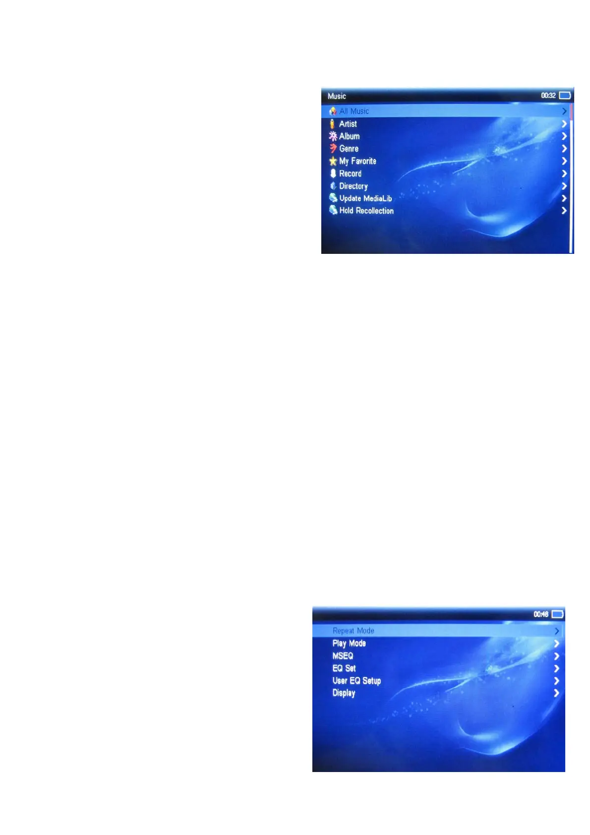 and pause. During the playing, press menu key to enter setting menu, you can set music playing mode: