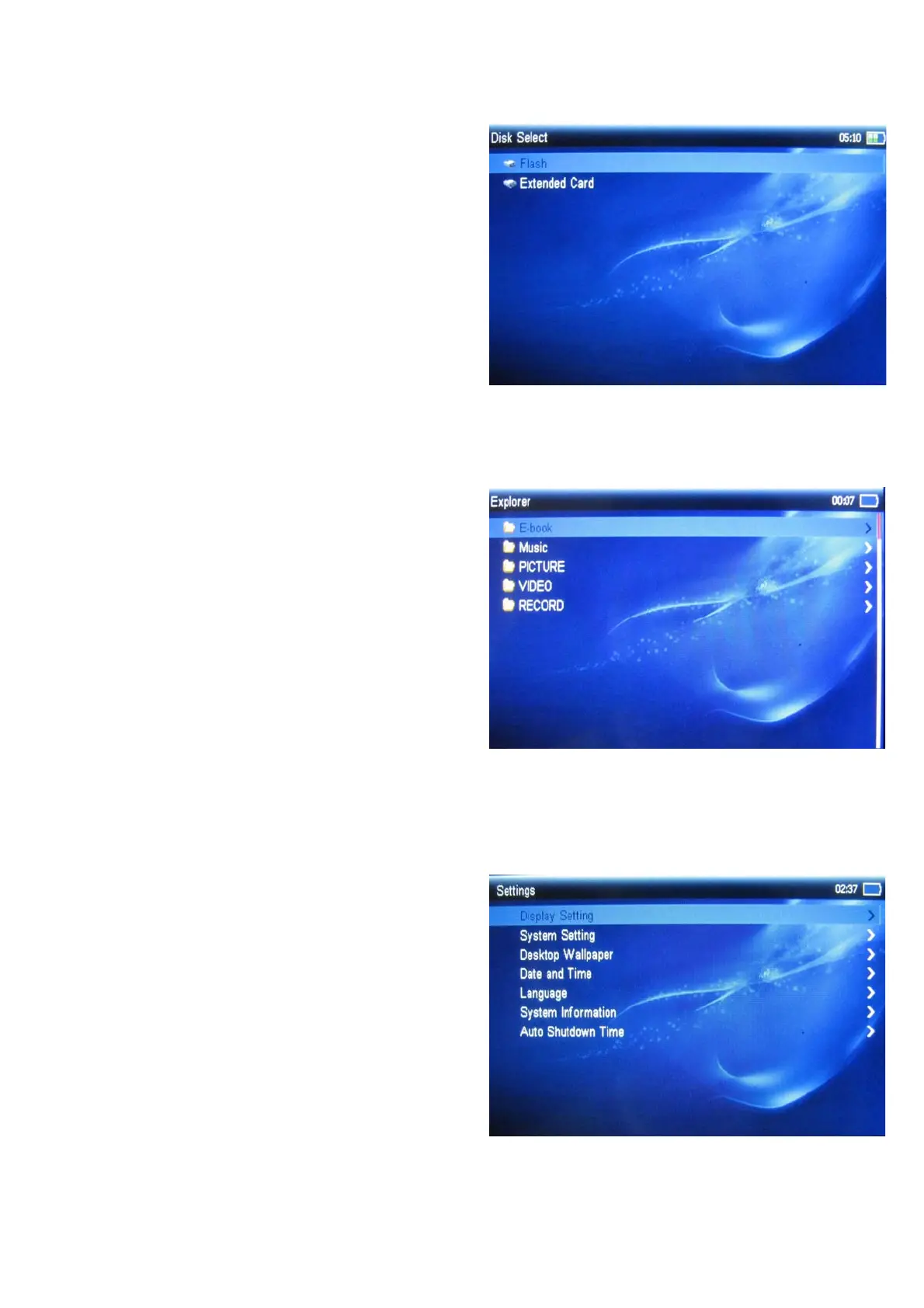 video / picture / e-book / music /record menu,
