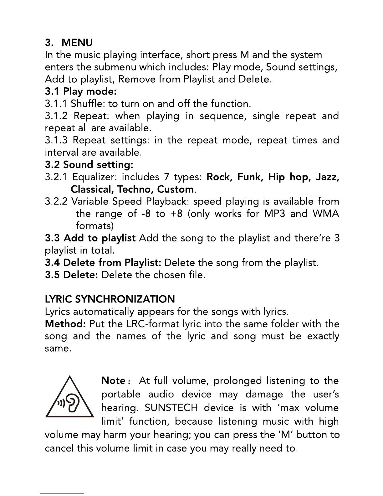 Sunstech SKYBT - Music Menu and Playback Options; Lyric Synchronization