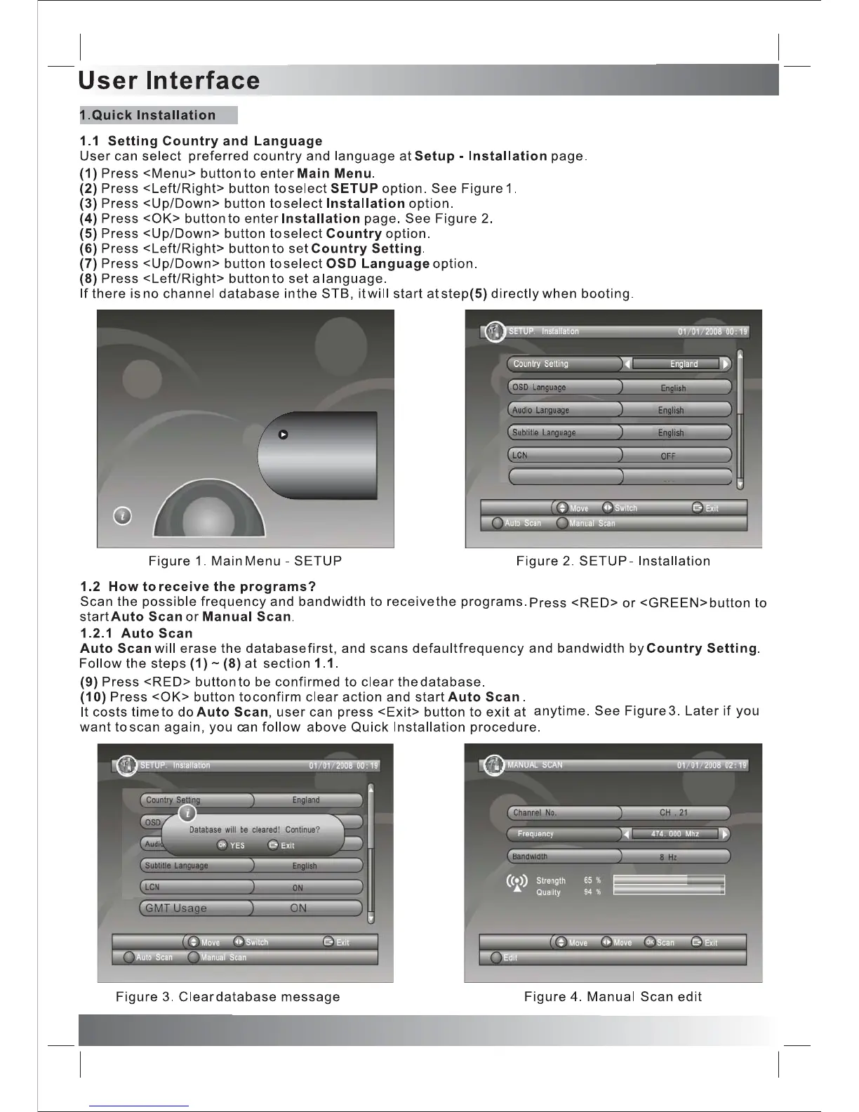 Sunstech TLE9 - User Interface; Quick Installation: Country and Language; Channel Scanning: Auto Scan