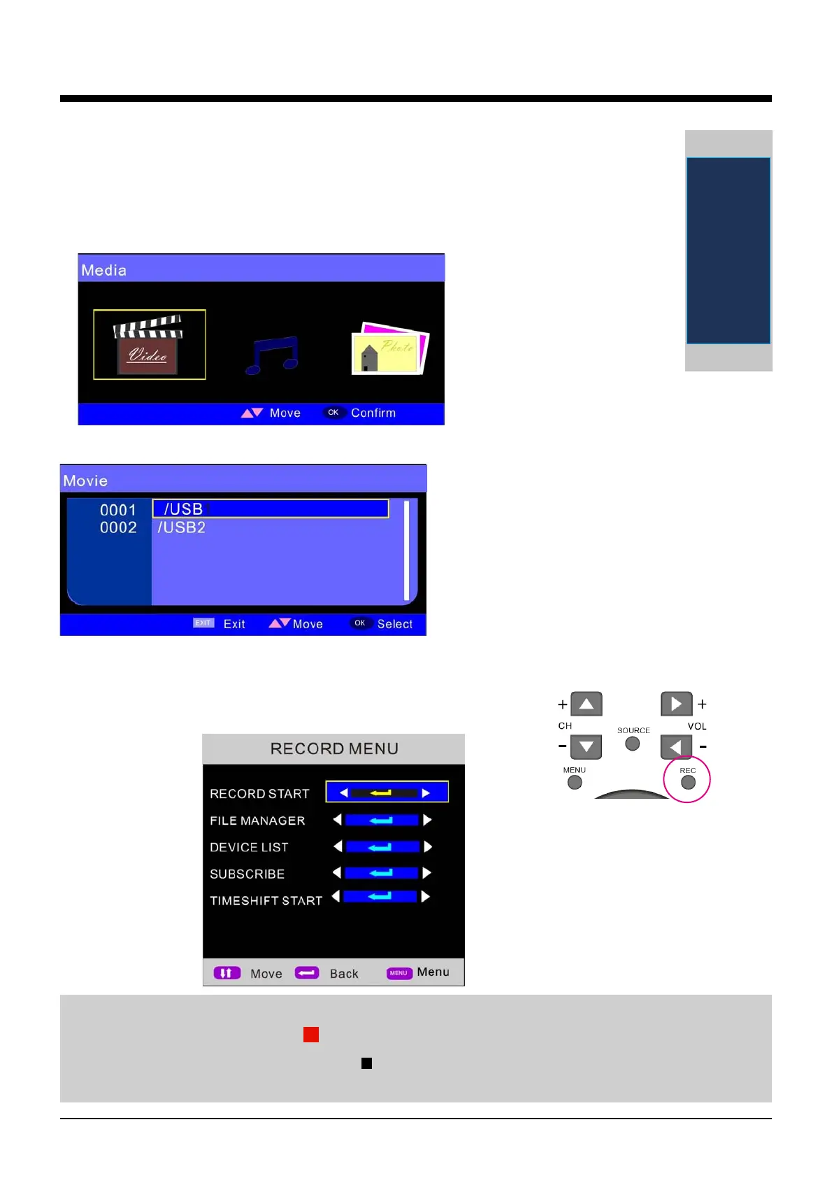 RECORD START: Press OK button on the item to start recording the current playing program.