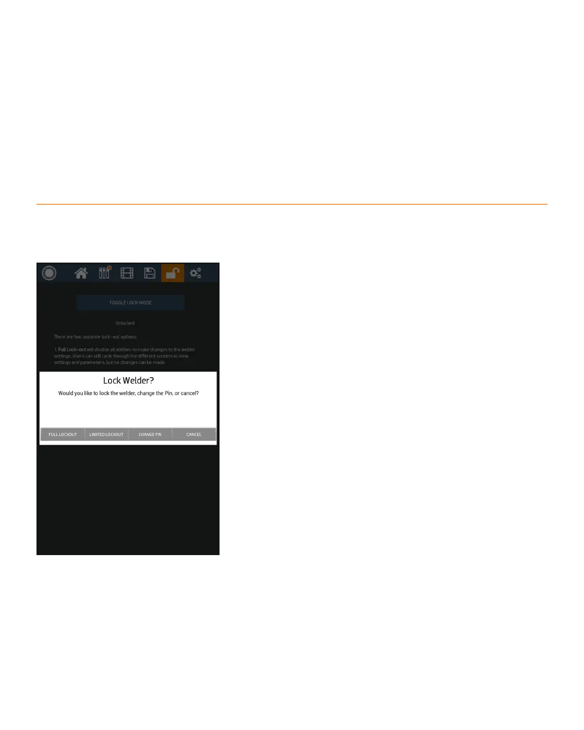 The Lock Screen can be used to limit an operator’s ability to make changes to the welder’s settings. To access