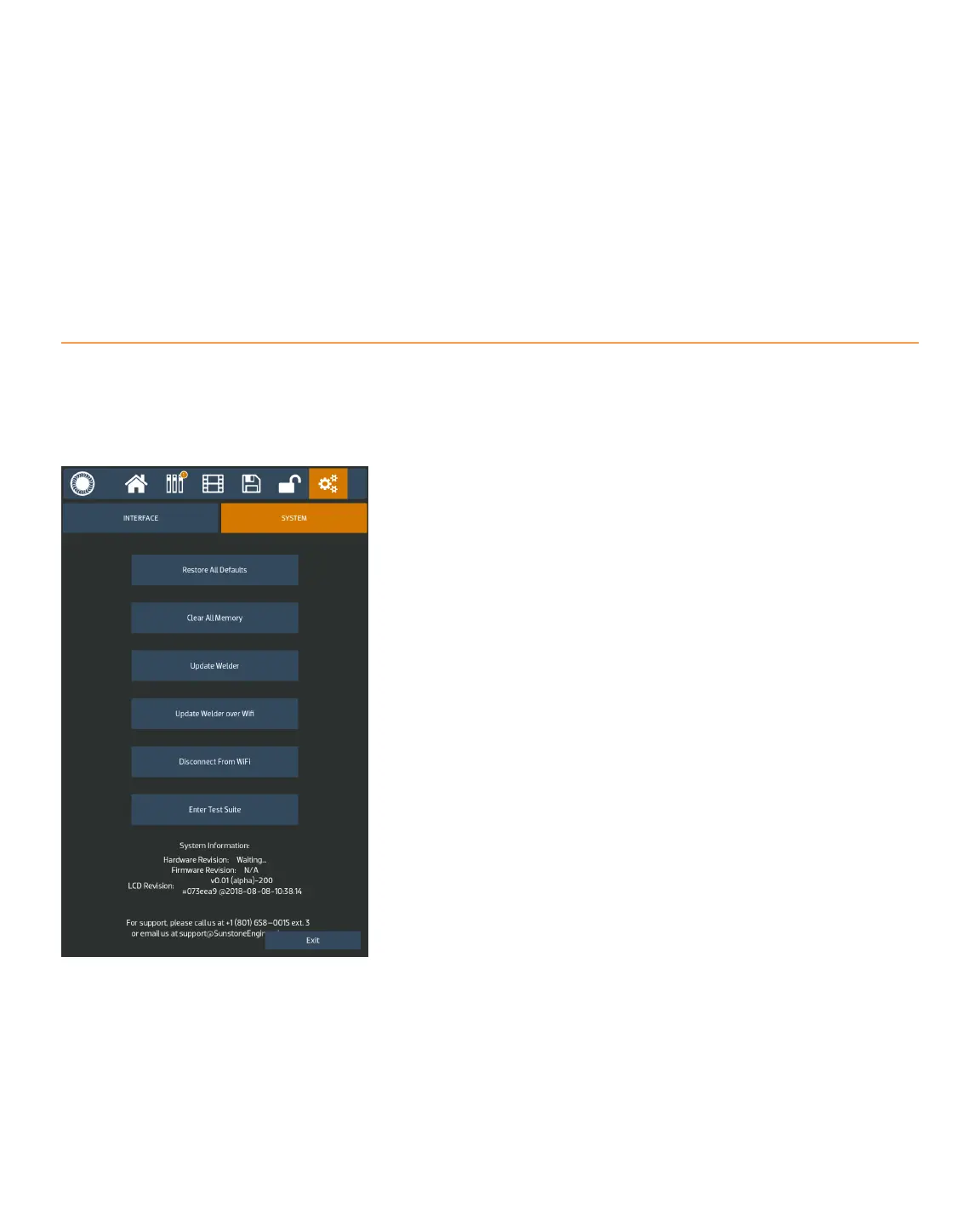 the welder’s general settings, press the Settings Button in the Navigation Bar. The Settings Screen will appear,