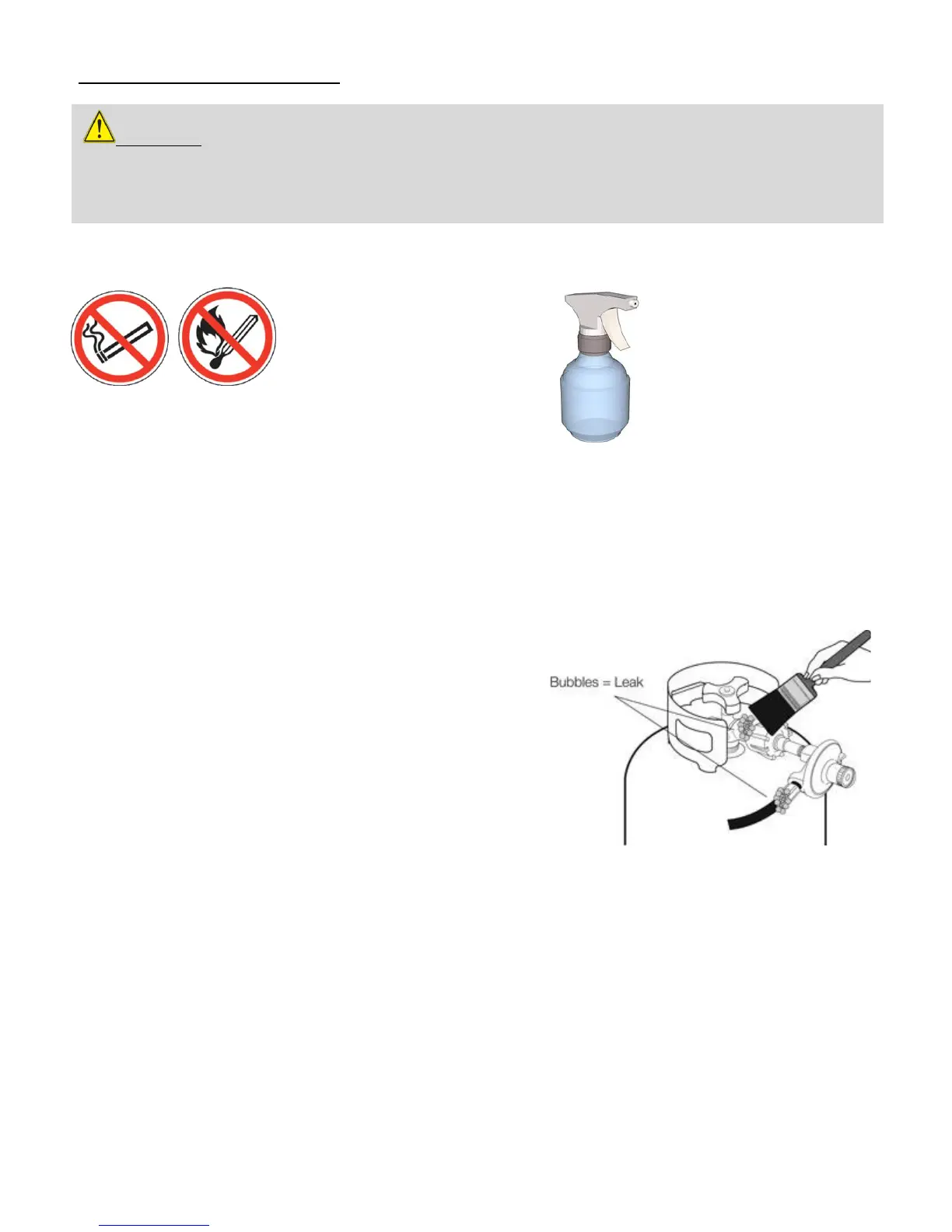 WARNING: Always take a leak test before lighting the grill to prevent a possible fire or explosion.