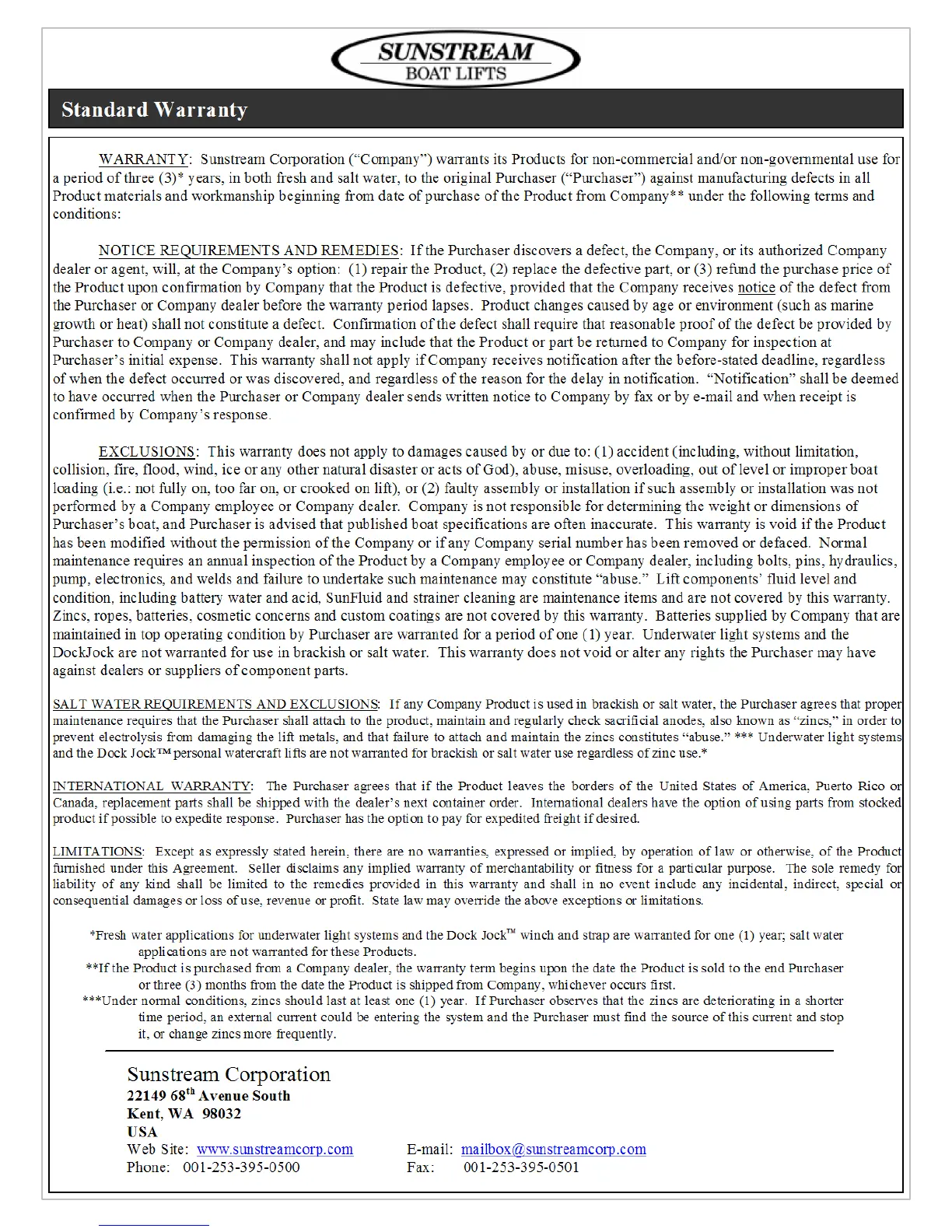 Sunstream FL6 HOVERCOVER - Standard Warranty; Notice Requirements and Remedies; Exclusions; Salt Water Requirements and Exclusions