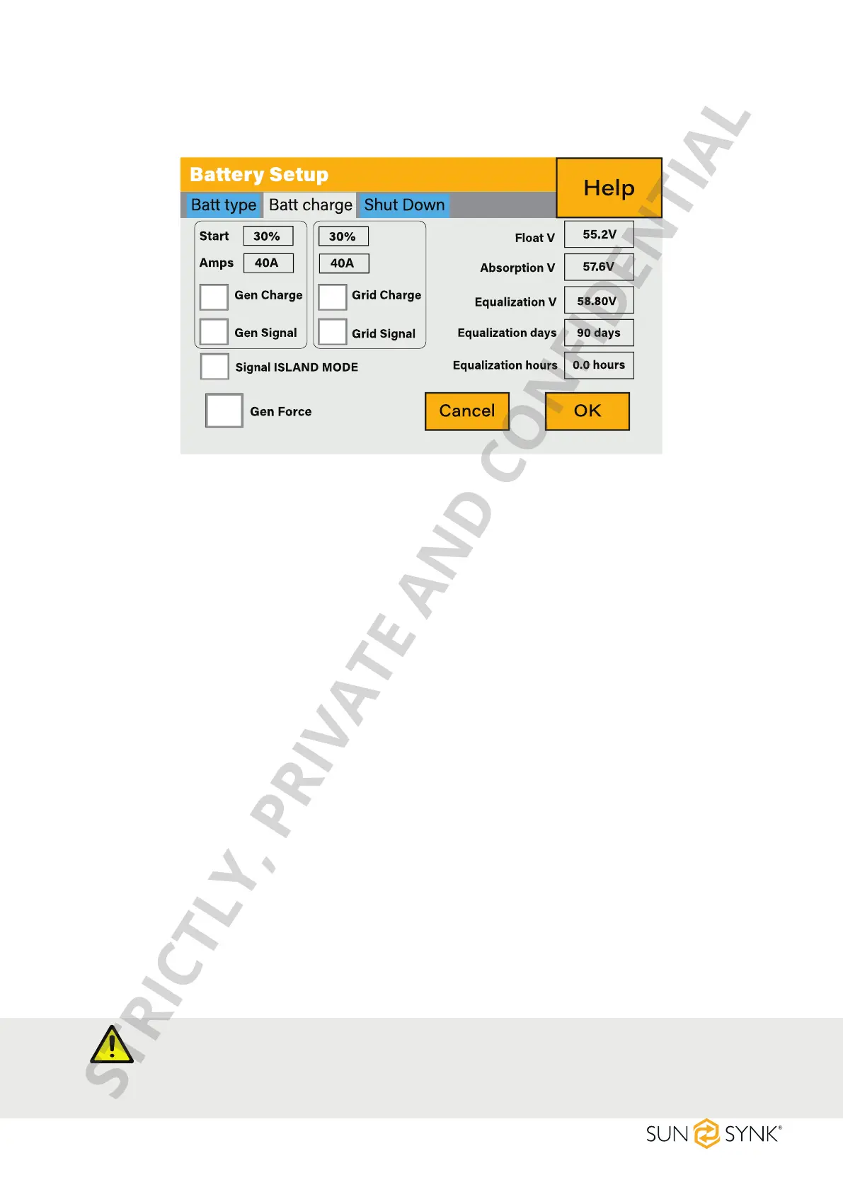 Start: Generator start voltage/SOC %. S.O.C at 30% system will AutoStart a connected generator to