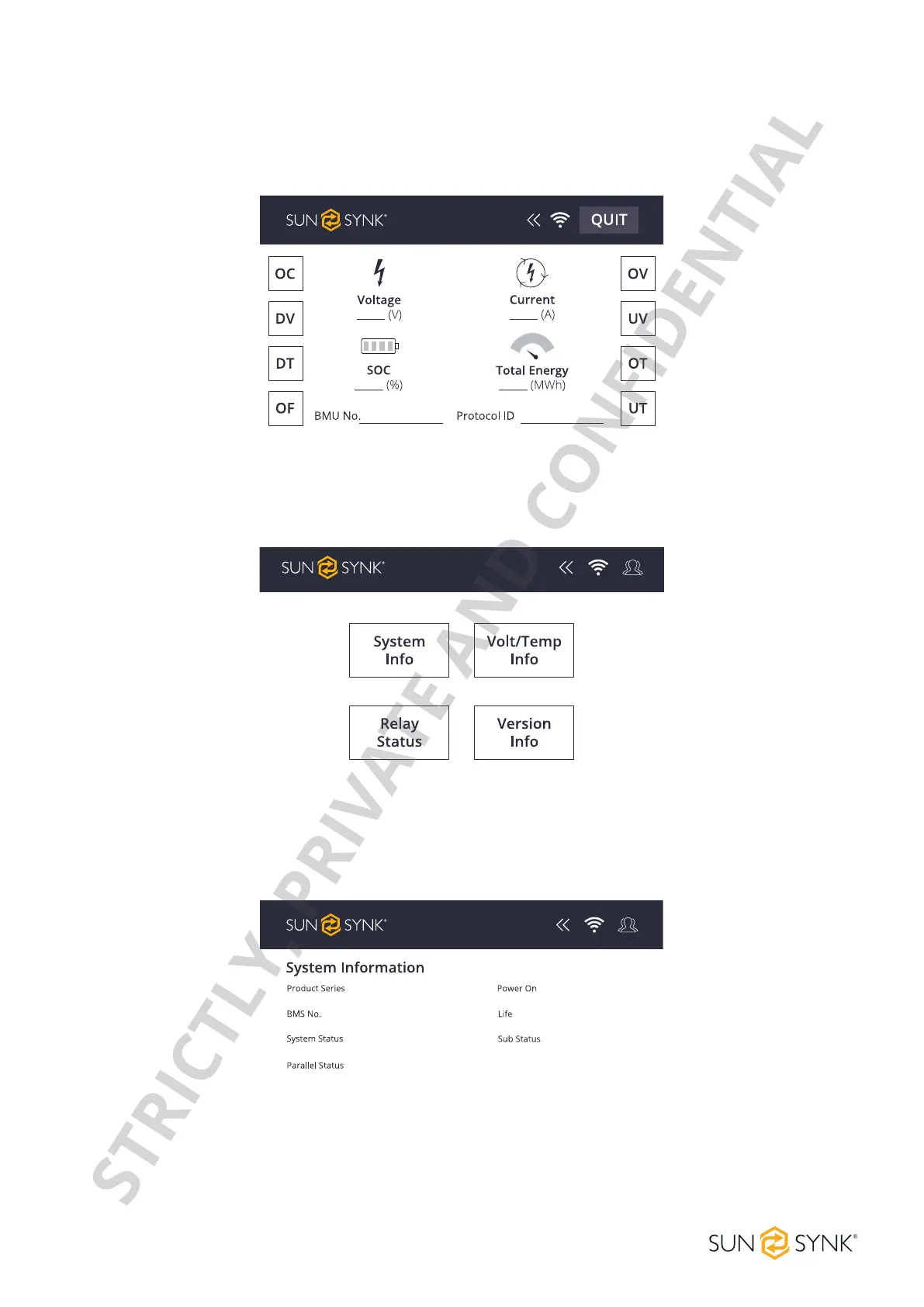 (MWh), the BMU number, and the protocol ID. Click this screen to enter the system maintenance menu. Click