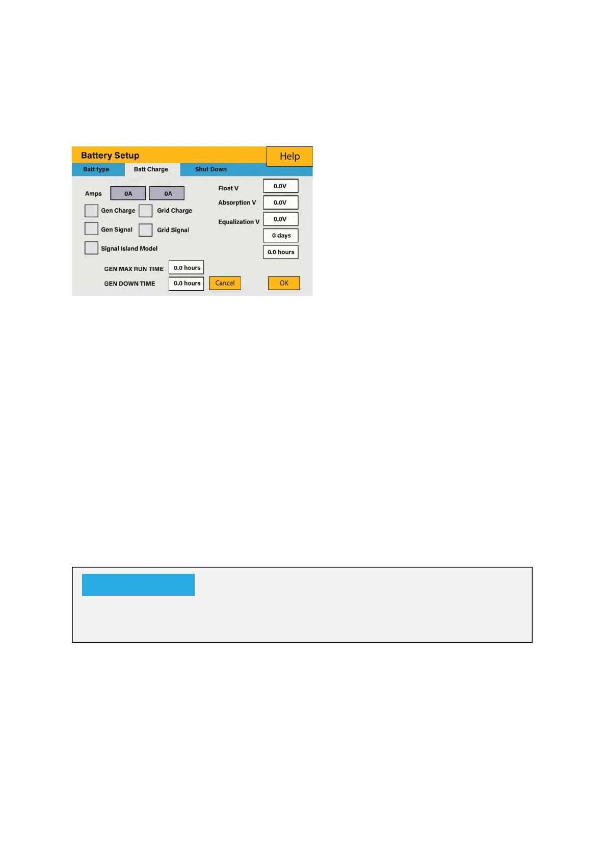 Gen Charge: Uses the GEN input of the system to charge battery bank from an