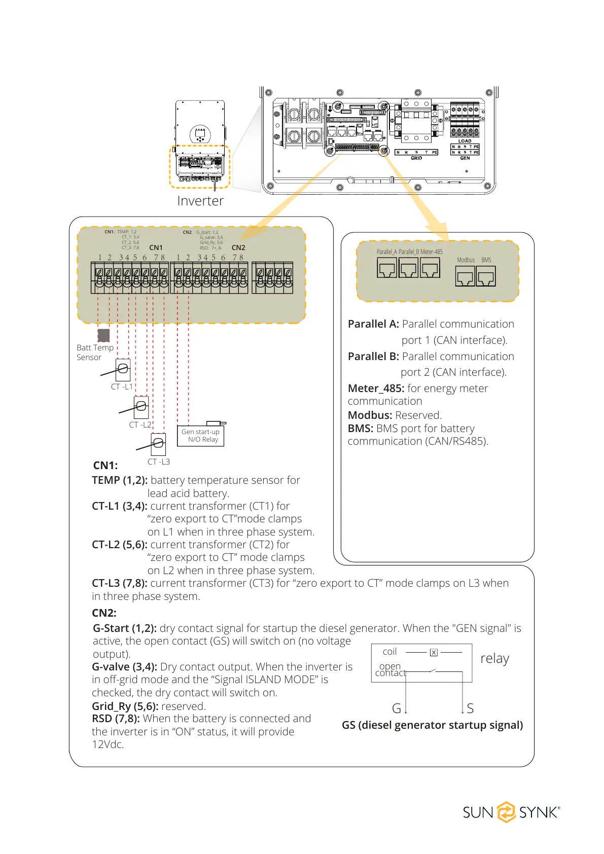 G-Start (1,2): dry contact signal for startup the diesel generator. When the "GEN signal" is