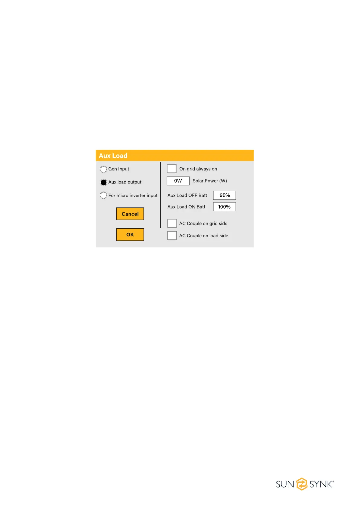 Aux Load ON Batt: Battery SOC at which the Smart load will switch on. Also, the PV input power should