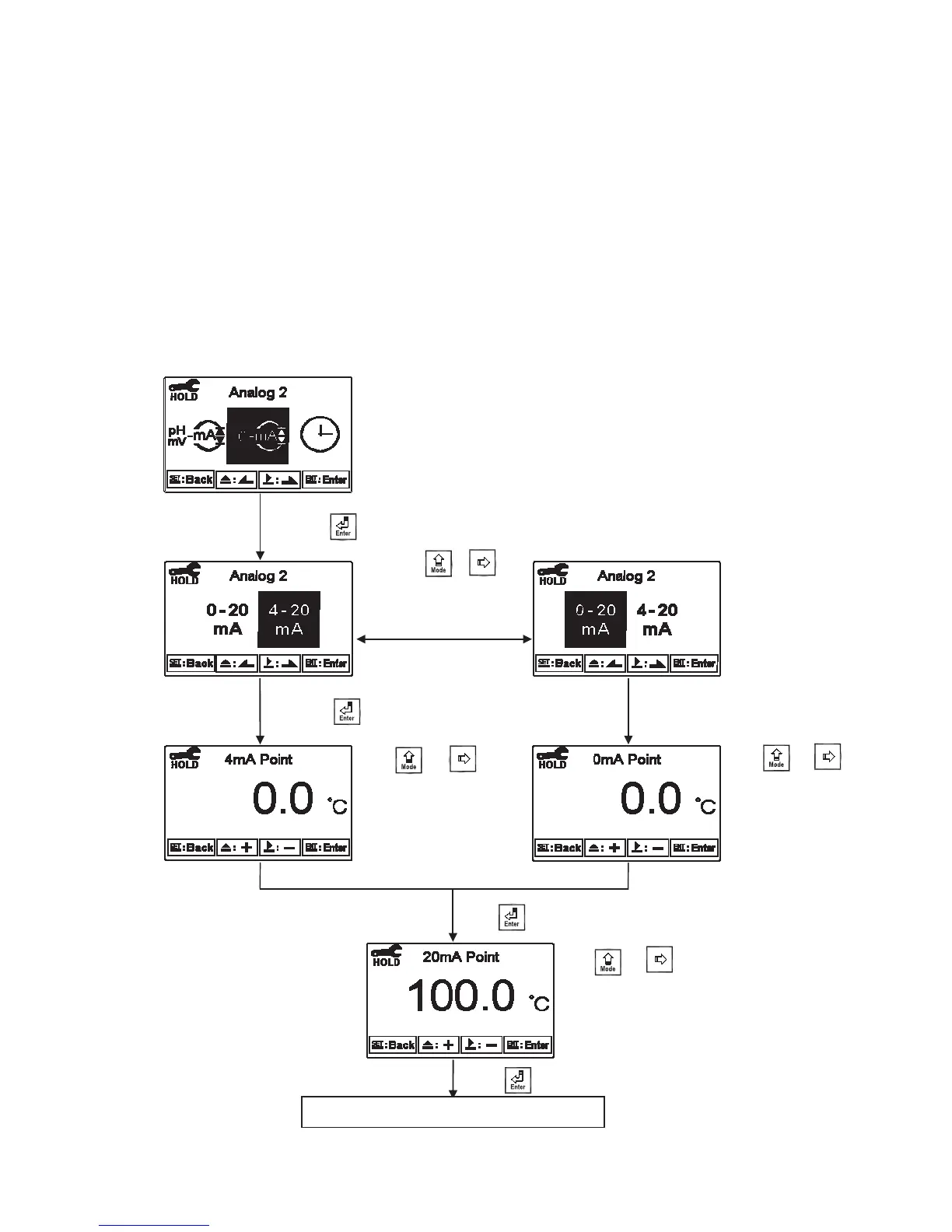 Enter setup of Analog 2. Select 0~20mA or 4~20mA current output. Set the related value to the