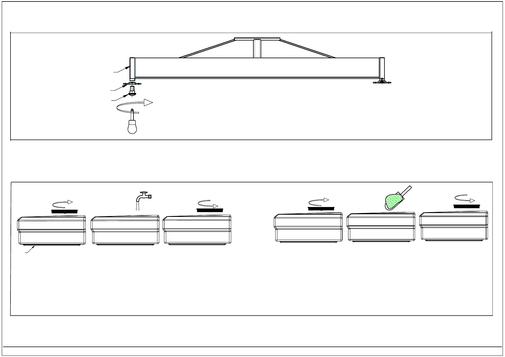 WARNING: Fill all four (4) Plastic Bases (B) completely with water or sand. When filled, total weight should be at least 130 kg / 285 lbs.