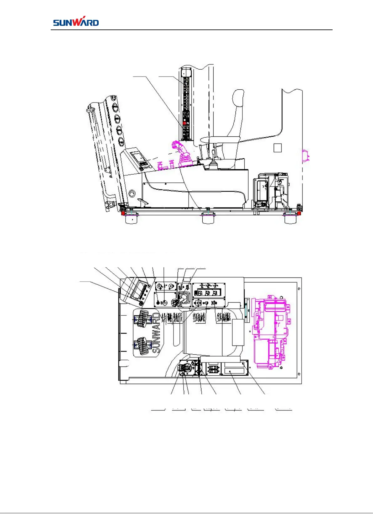 Fan, grease lubrication, horn, rod discharge/upper clamp, dust hood/lower clamp, radio, air conditioner panel