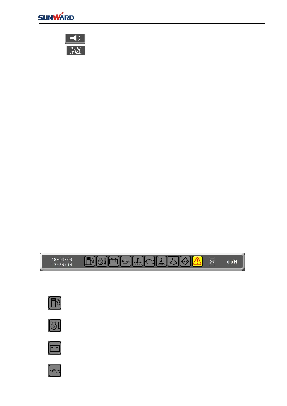 Fuel level alarm prompt: when the fuel is too low (generally less than 15%) this icon
